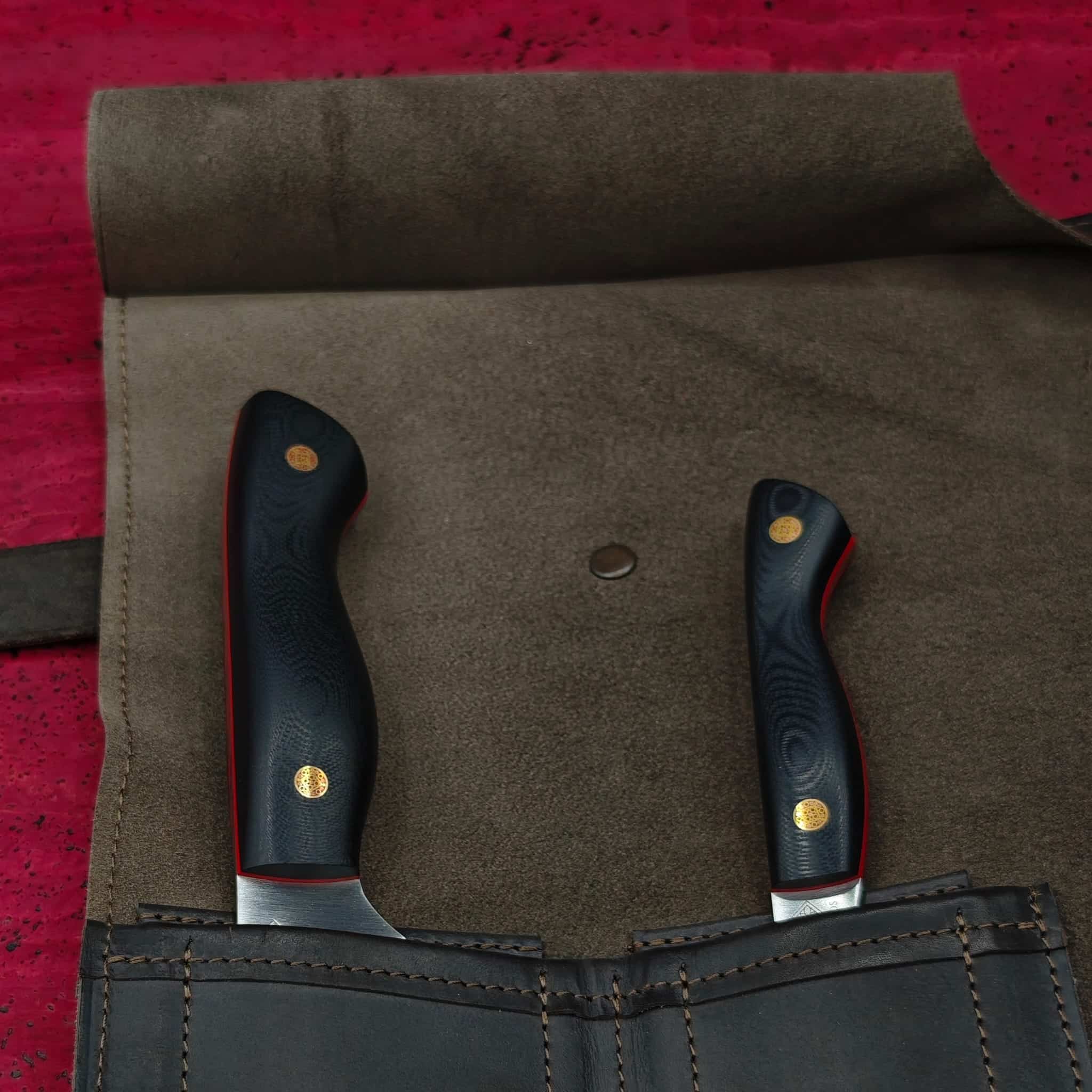 Pour compléter cet ensemble, nous proposons une mallette souple en cuir de veau, réalisée à la main par une maroquinière talentueuse à Thiers. Cette mallette protège et transporte vos couteaux avec style et sécurité. Elle apporte également une note de luxe à votre expérience culinaire.