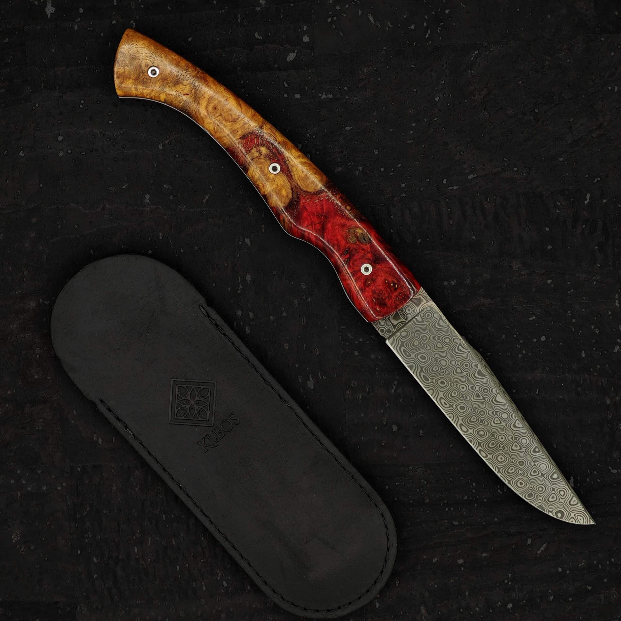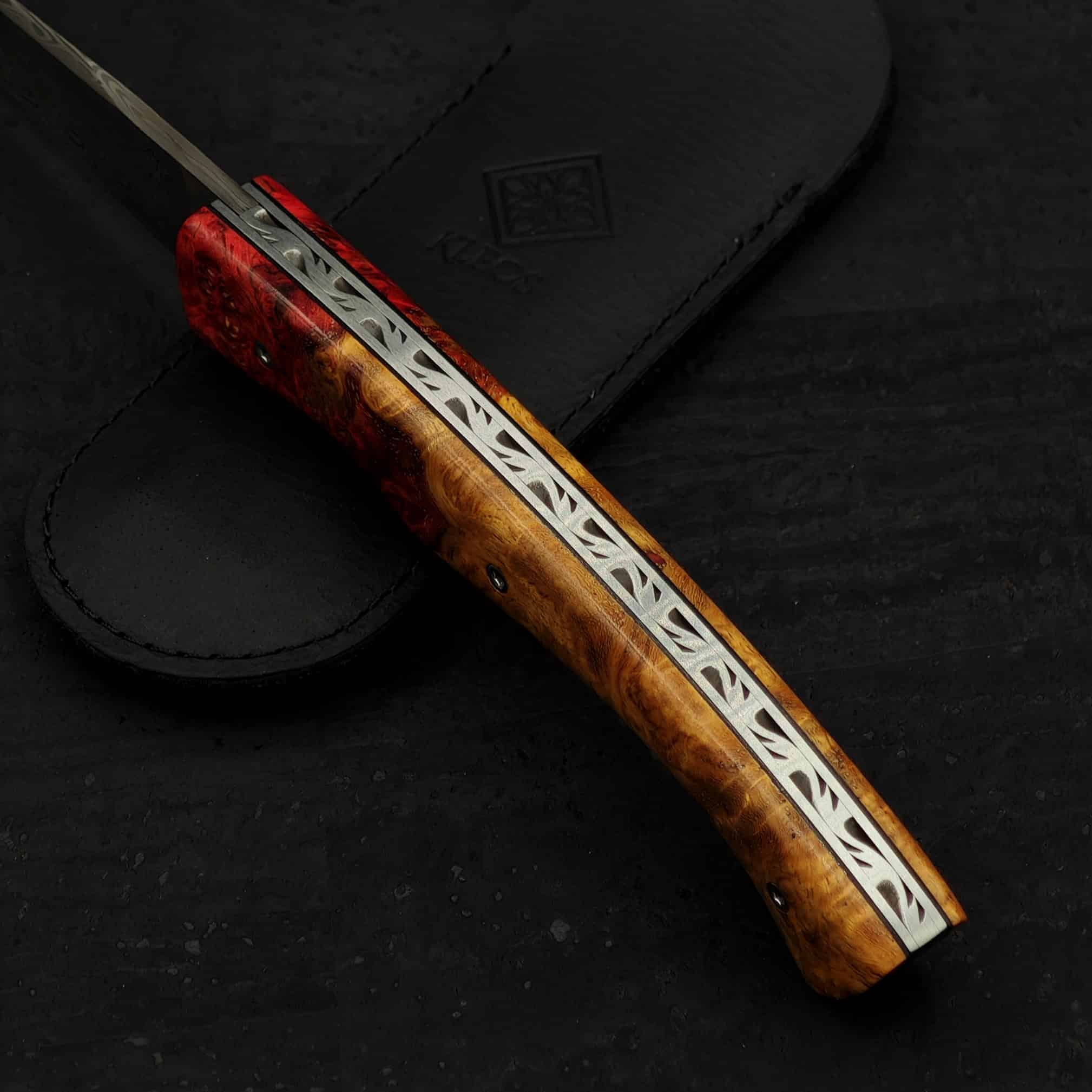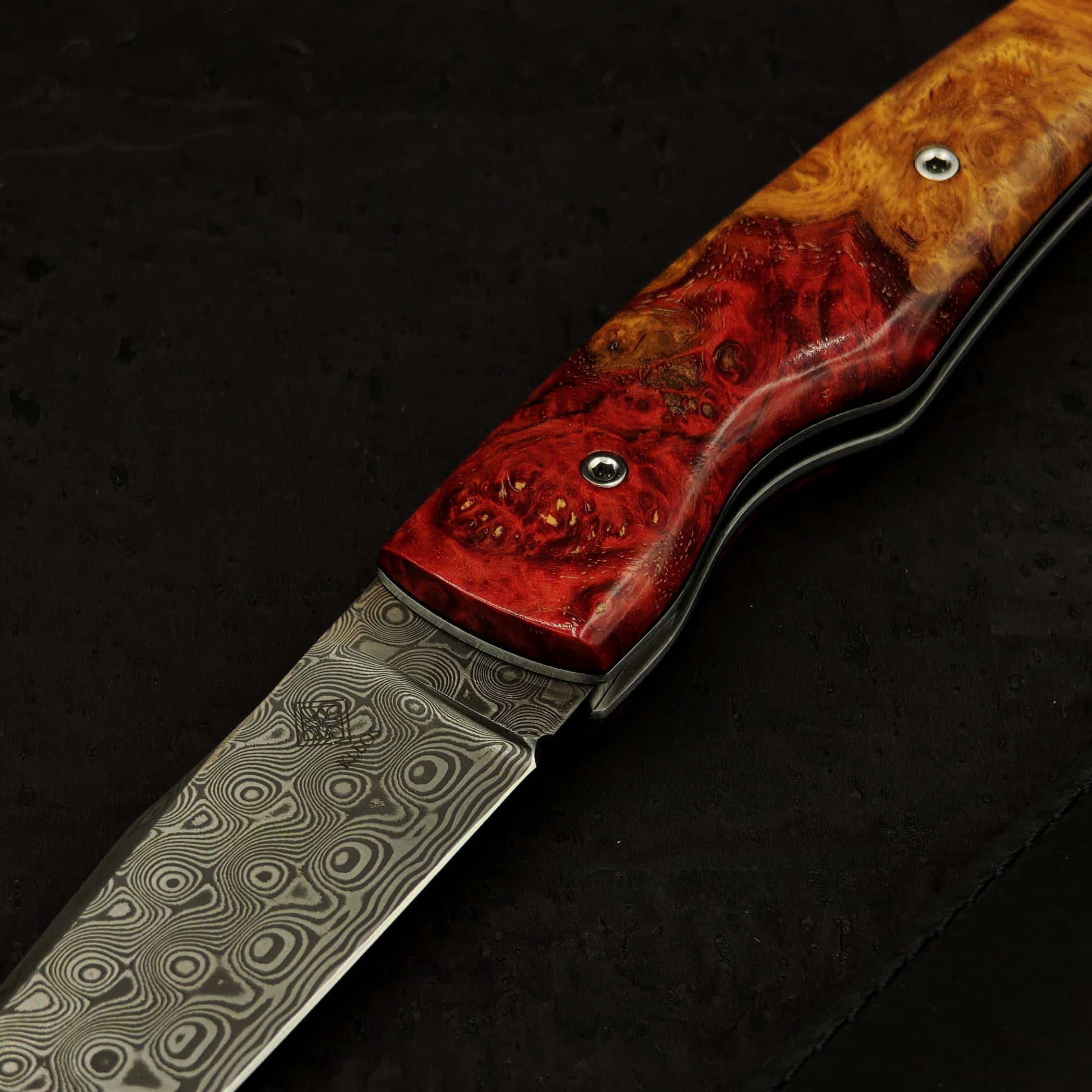 Les plaquettes du manche sont réalisées en loupe d’amboine stabilisée et teintée rouge, un bois rare dont les veinures spectaculaires créent un rendu vivant et contrasté. Ce matériau, à la fois noble et solide, offre une excellente longévité et un toucher chaleureux. La teinte rouge, profonde et vibrante, renforce le caractère prestigieux du couteau.