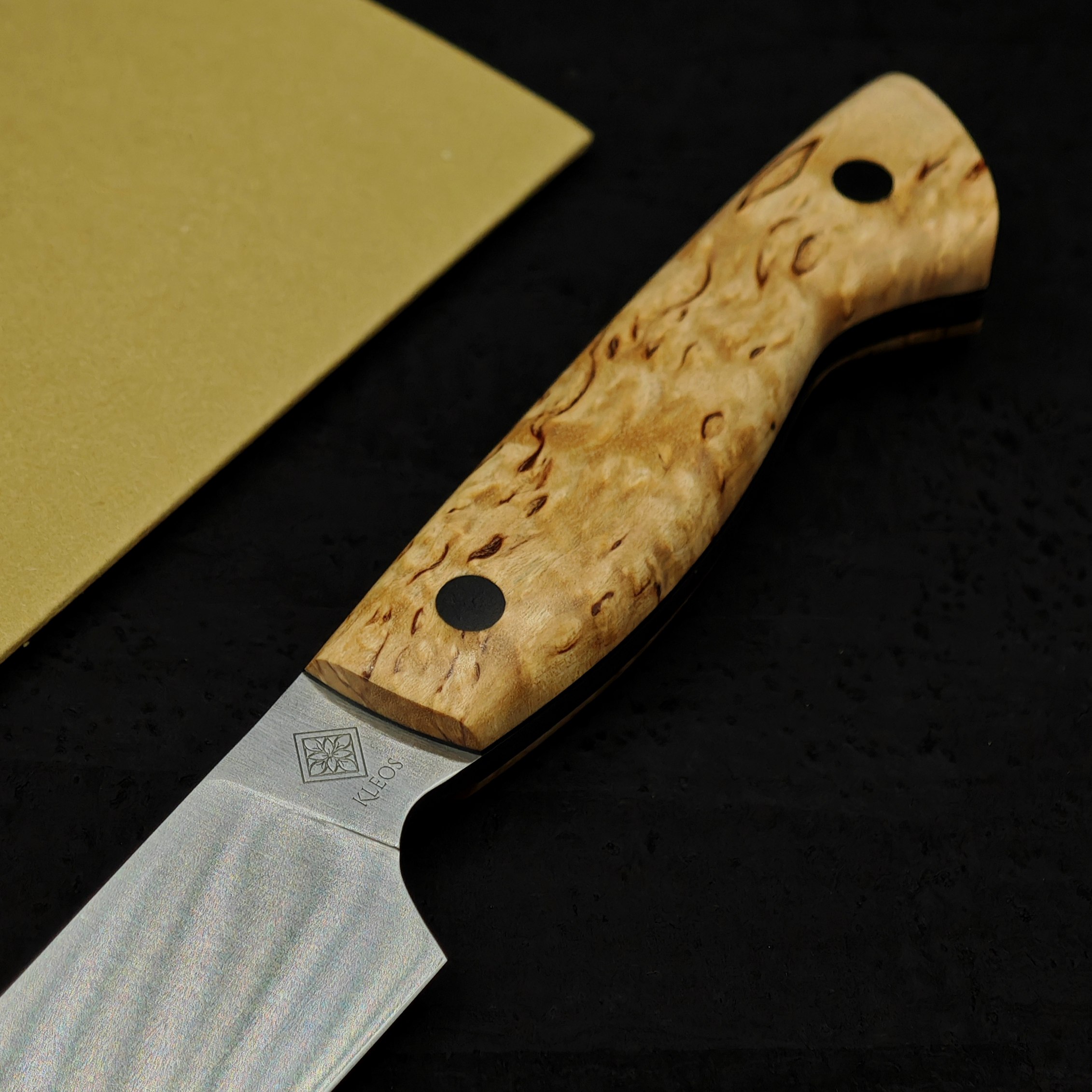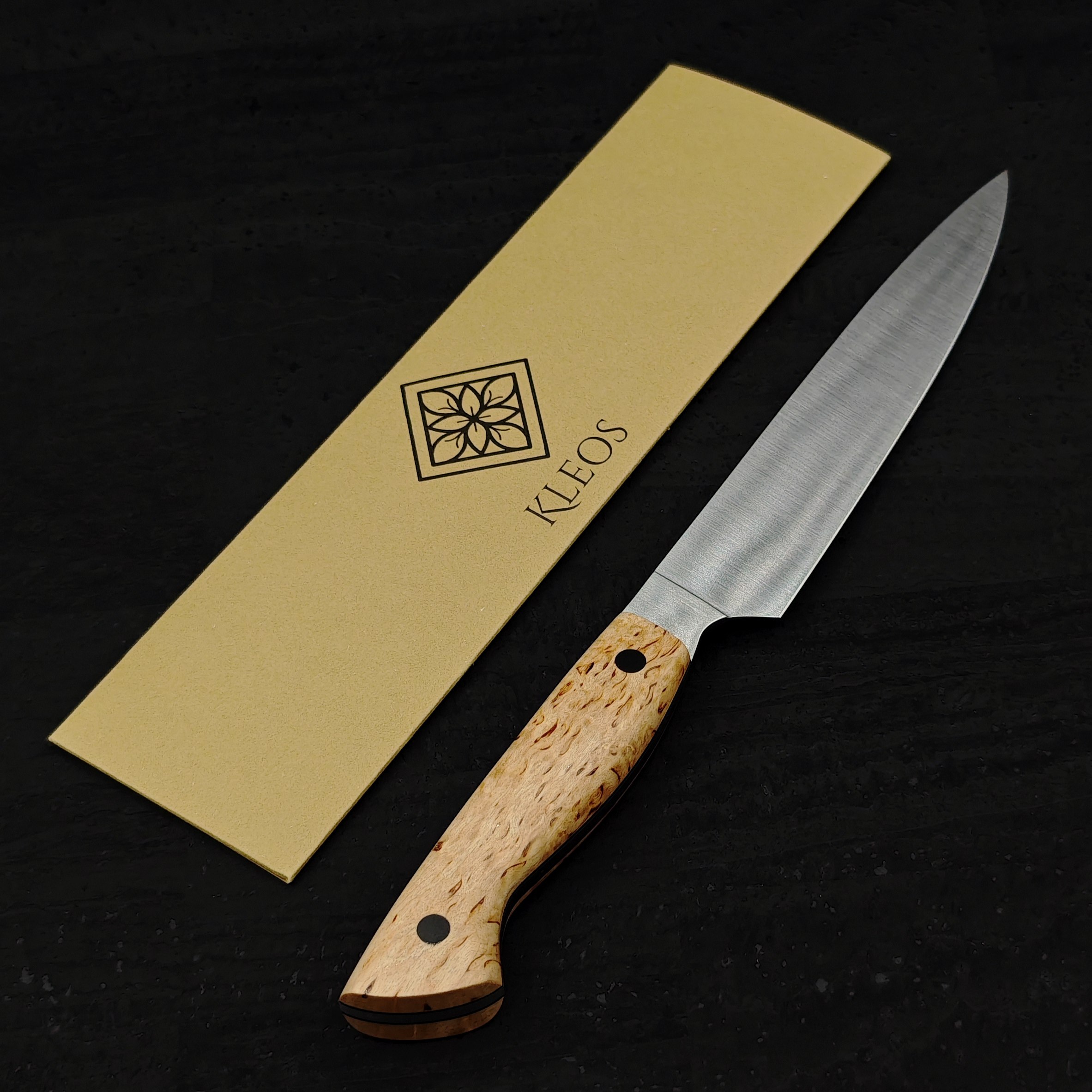 Ce couteau grand office en bouleau madré de Norvège offre un équilibre parfait entre élégance, précision et authenticité. Son manche en bois naturel, non stabilisé, révèle un veinage clair et contrasté, caractéristique du bouleau madré nordique. Chaque manche possède ainsi un motif unique, faisant de ce couteau un outil aussi pratique qu’esthétique.