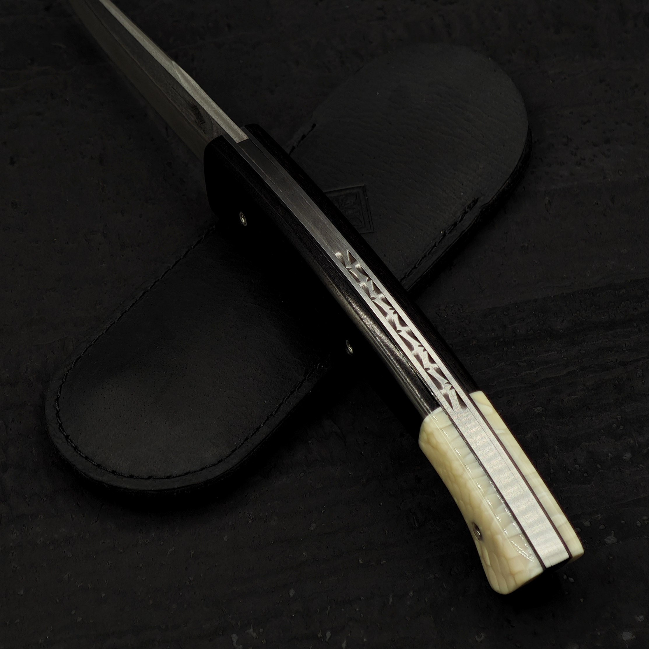 Le manche bi-matière est composé d’ébène du Gabon et de résine. Cette alliance de tradition et de modernité donne naissance à un couteau d’une élégance rare, à la fois robuste et esthétique.