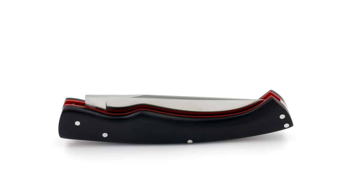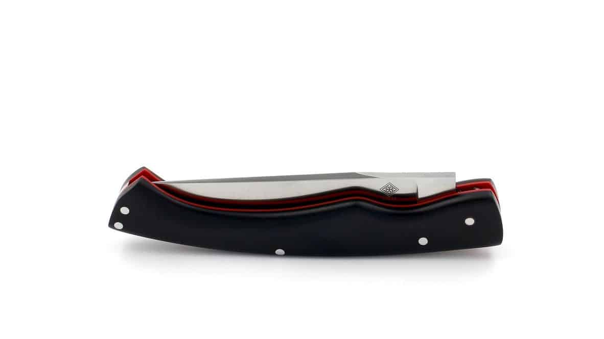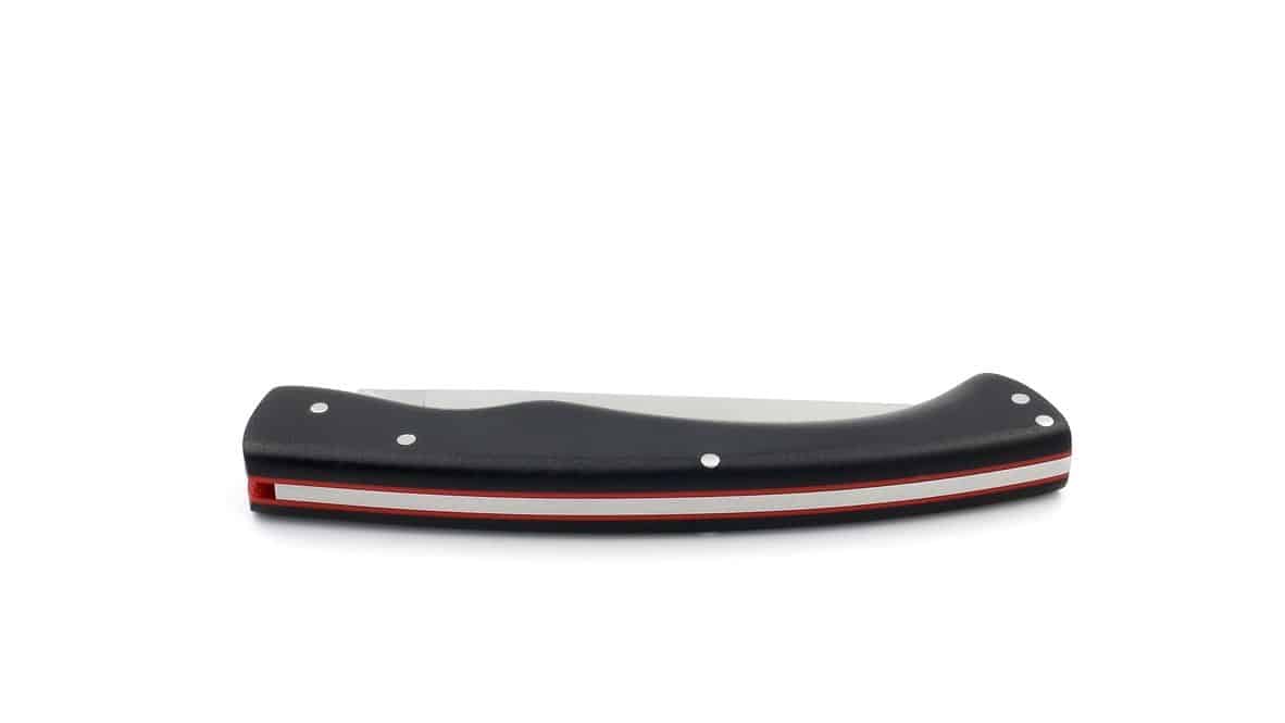 Le manche en G10 noir, associé à des intercalaires rouges, constitue l’un des points forts de ce modèle. Le G10, apprécié dans le monde de l’EDC pour ses propriétés exceptionnelles, offre :