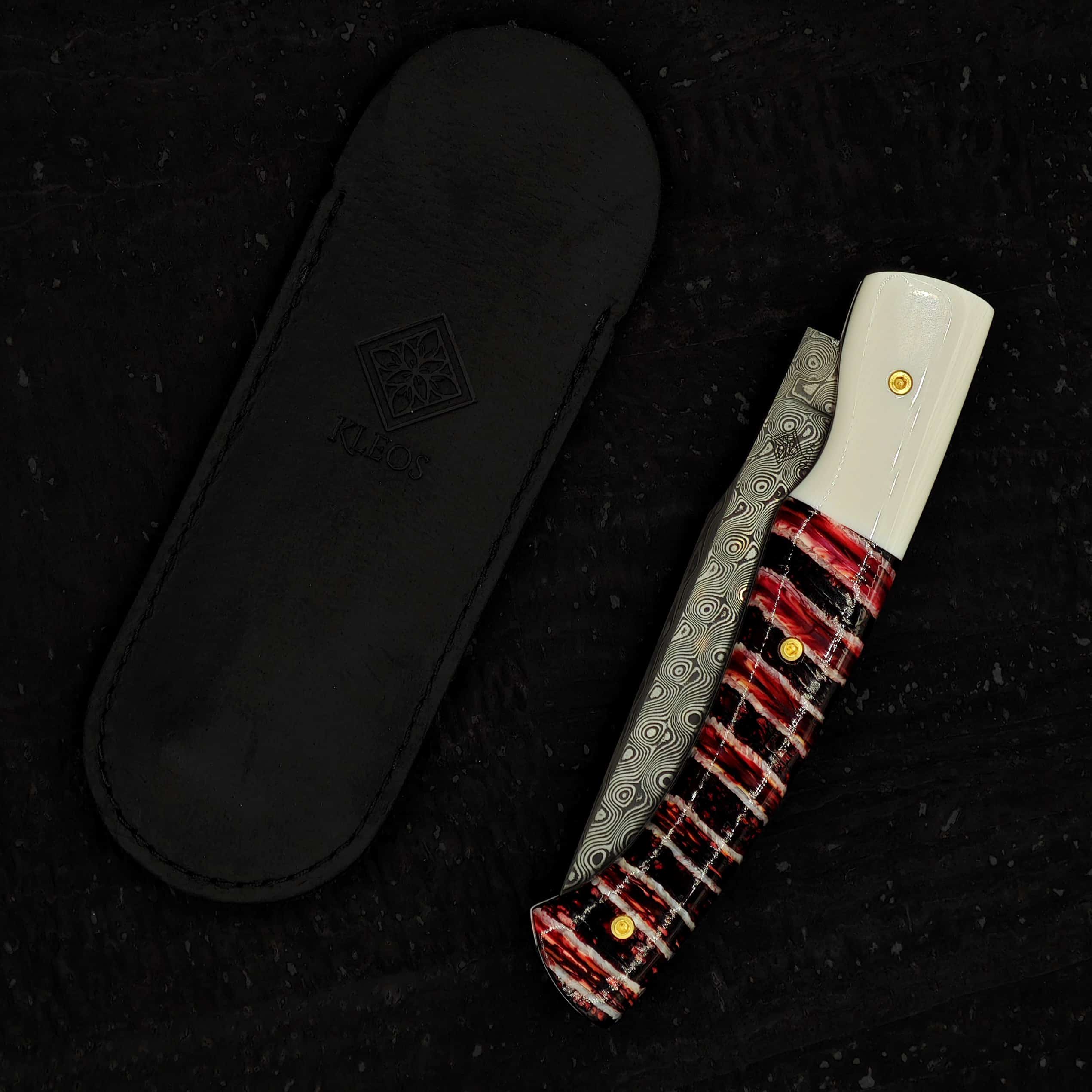 Les vis inox plaquées OR, esthétiques, complètent l’ensemble avec une touche luxueuse et soulignent l’harmonie du design. Un étui en cuir sur mesure, conçu pour s’adapter parfaitement à la forme du couteau, permet de le transporter en toute sécurité et avec élégance.