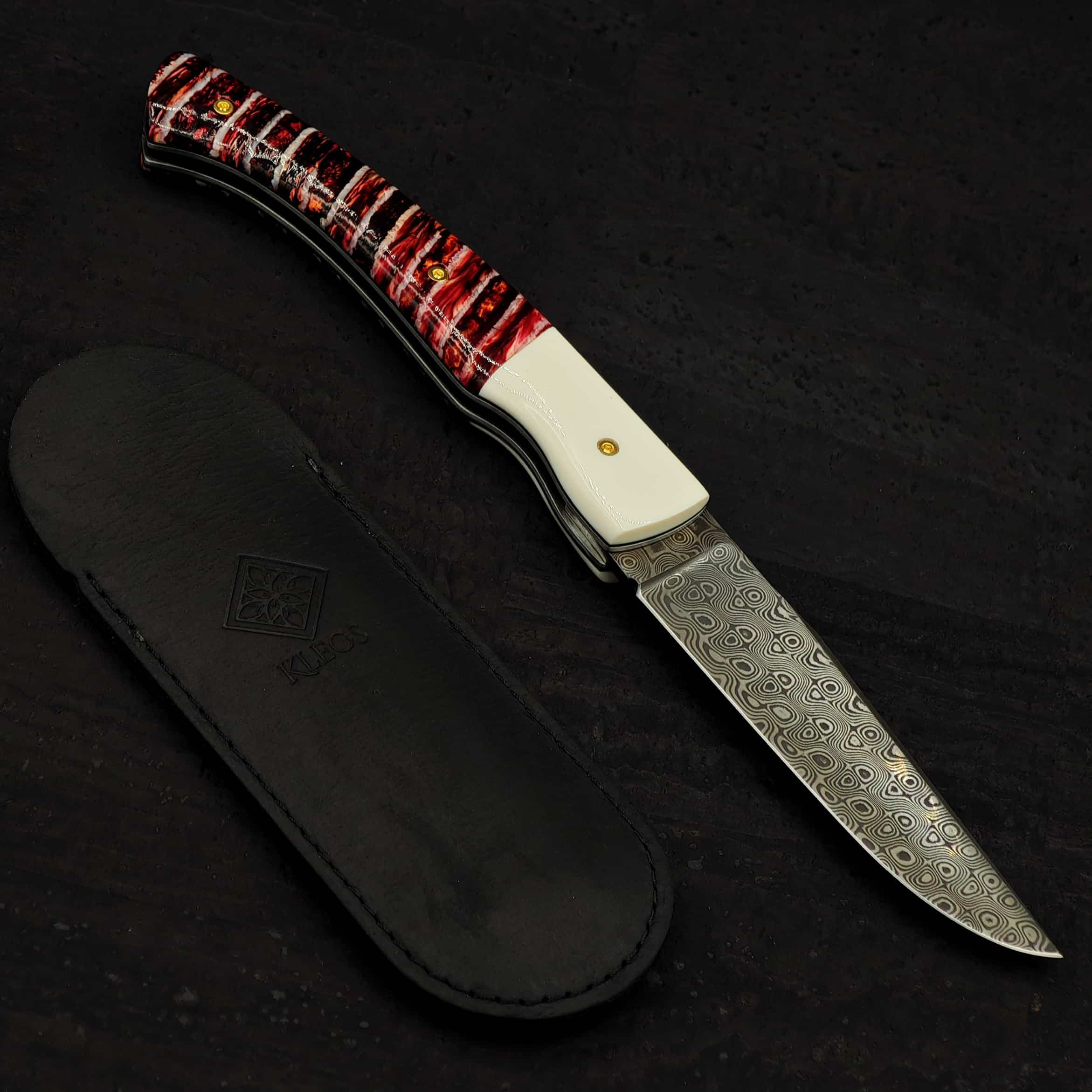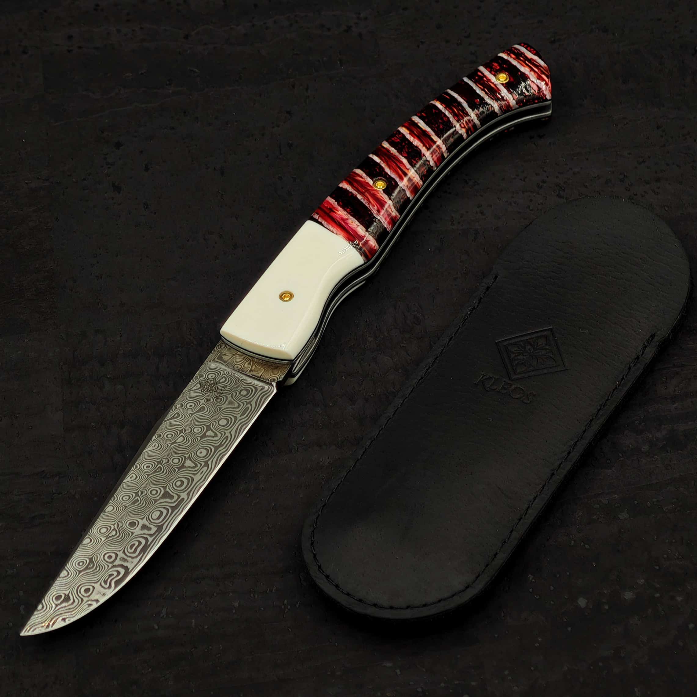 Le manche bi-matière, composé d’une mitre en ivoire synthétique et du reste en molaire de mammouth stabilisée et teintée rouge (oui, oui, du mammouth !), ajoute une dimension supplémentaire à ce couteau. L’ivoire synthétique, léger et résistant, complète parfaitement l’aspect coloré et les motifs uniques de la molaire de mammouth, un matériau rare et précieux qui confère à chaque couteau son caractère propre. Le ressort guilloché à la lime et les platines en inox viennent parfaire le tout, offrant une finition soignée et un toucher agréable.