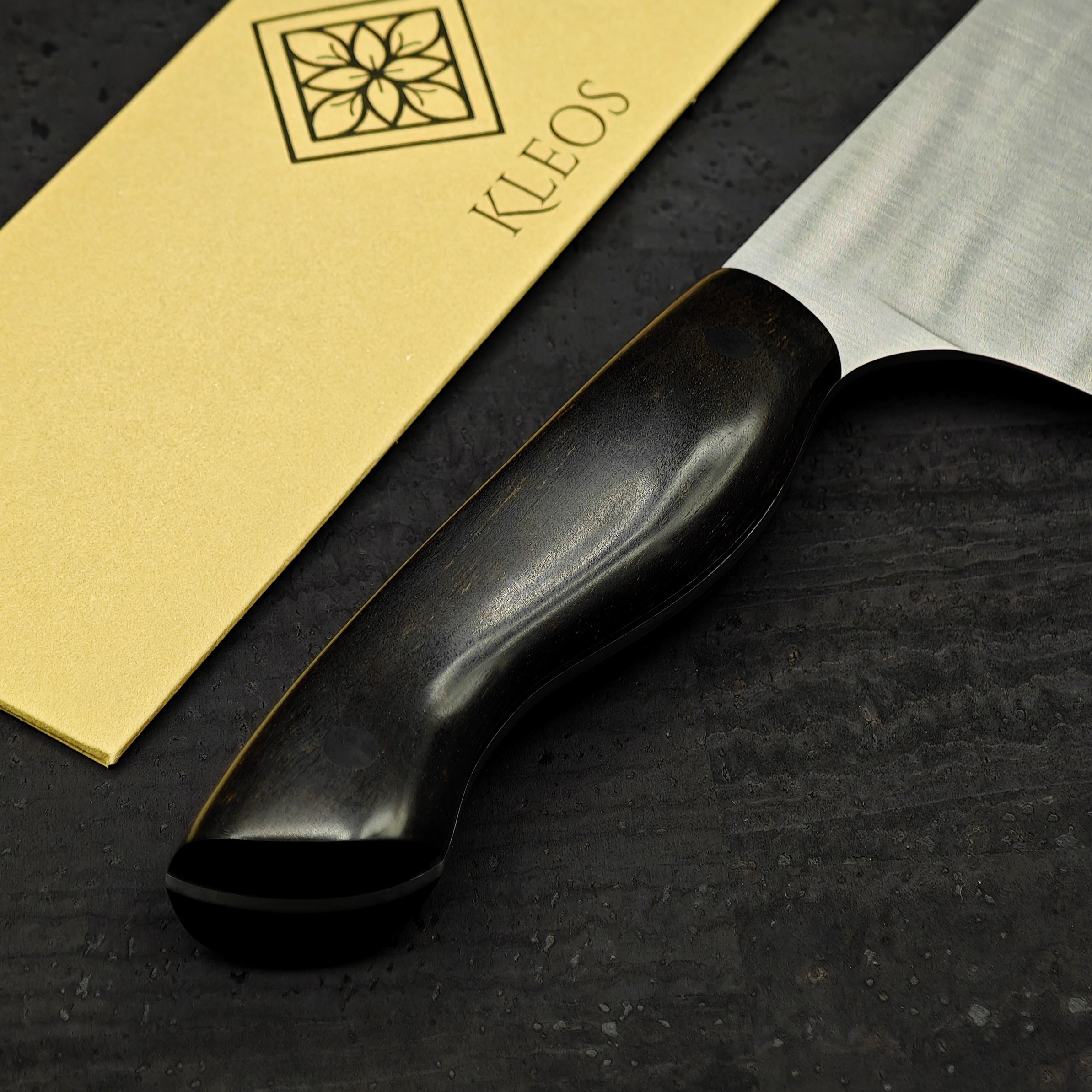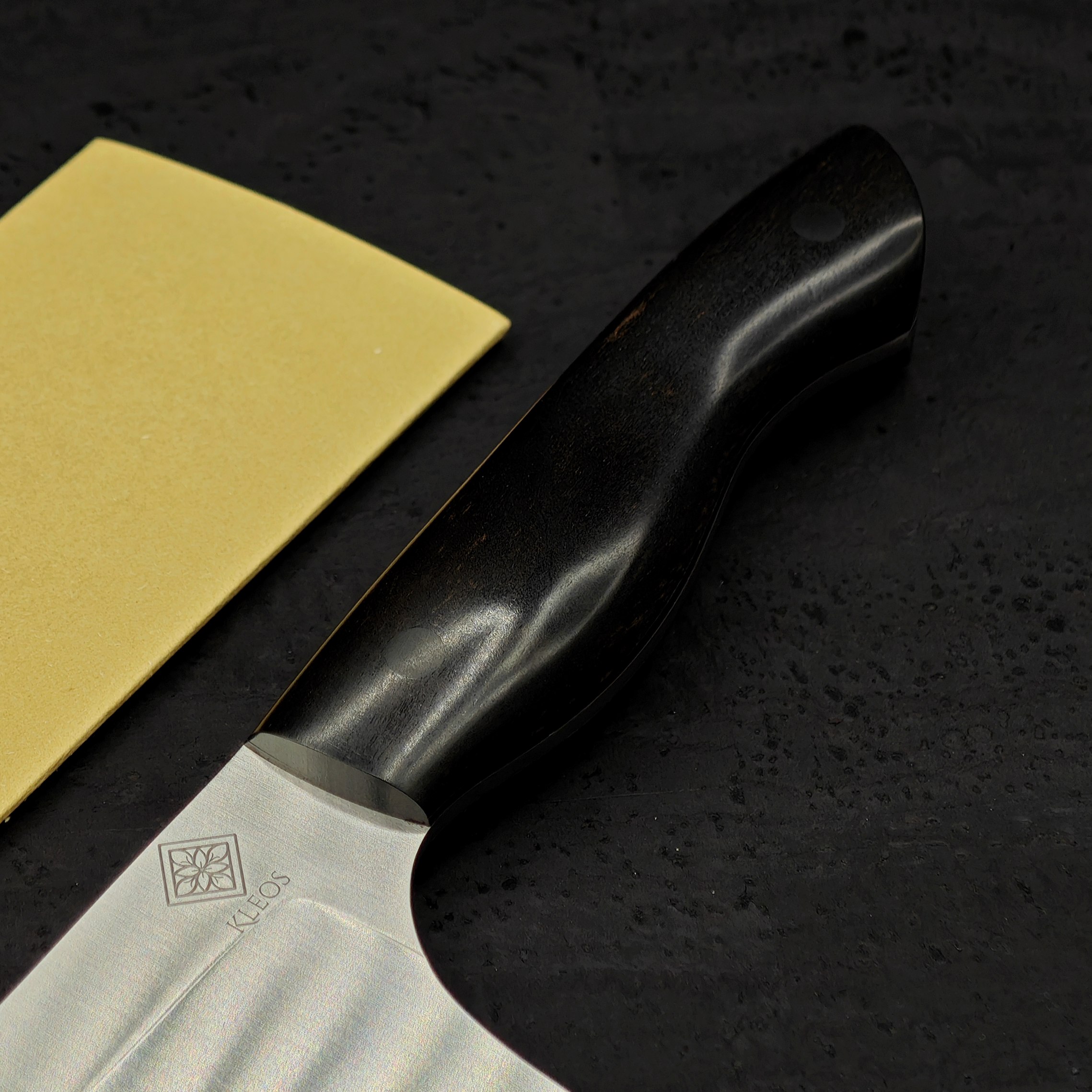 Reconnu pour sa densité et sa résistance naturelle, l’ébène du Gabon apporte une prise en main ferme et confortable. Sa teinte profonde crée un contraste élégant avec la lame inox. Pour assurer une construction fiable, ce manche intègre une fixation par vis ainsi que des inserts en fibre de carbone. Ces détails renforcent non seulement la solidité du couteau, mais ajoutent également une touche moderne et sophistiquée.