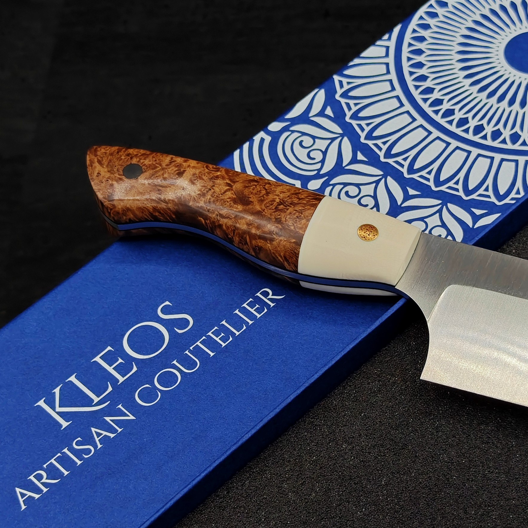 Le manche en loupe d’érable stabilisée et teintée marron donne au couteau une allure sophistiquée. Ce matériau, stabilisé pour une meilleure longévité, présente des motifs naturels uniques.