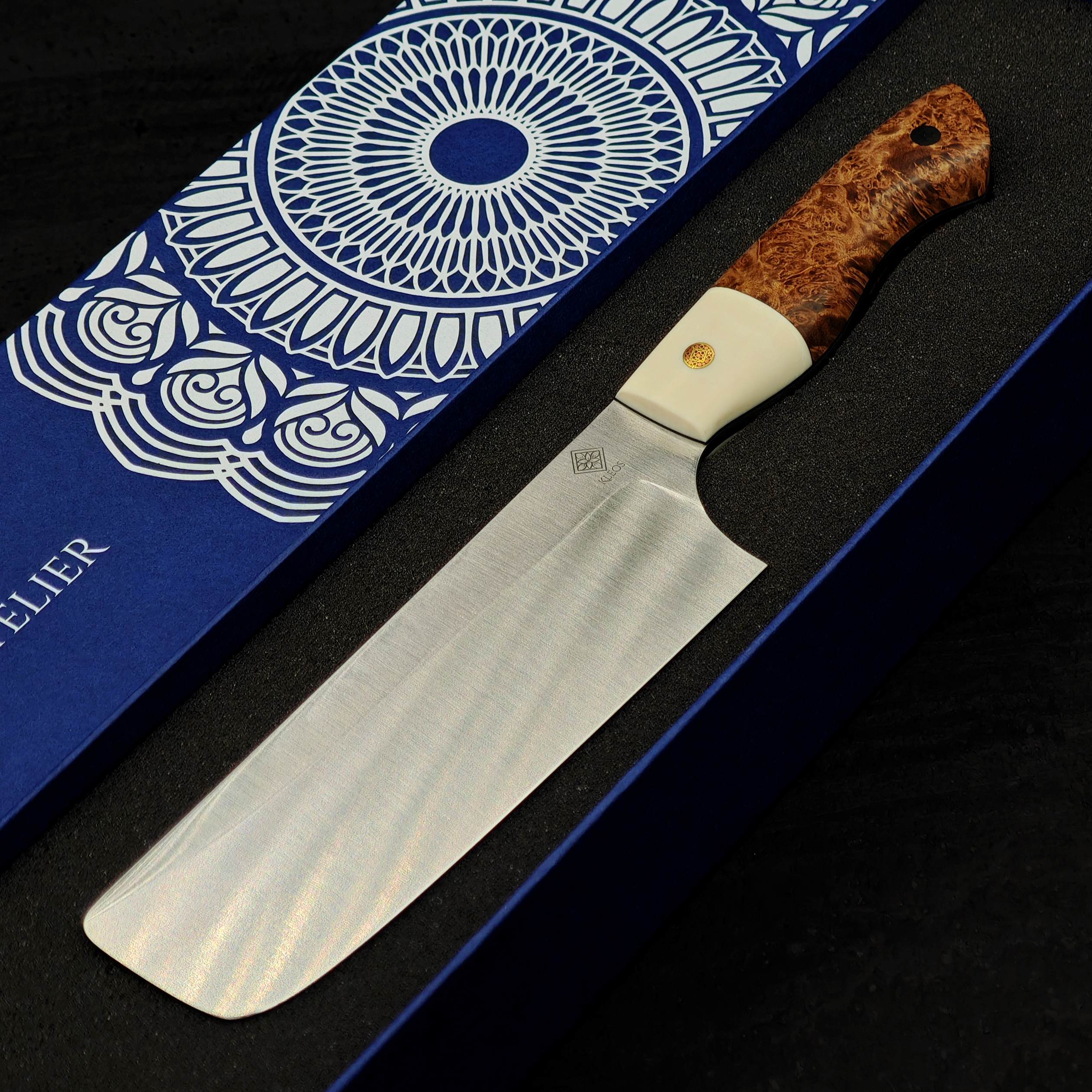 Le Nakiri bois stabilisé marron est un couteau pensé pour les amateurs de précision et de régularité en cuisine. Son format rectangulaire, typique des éminceurs japonais, permet de couper les légumes avec une grande facilité. Grâce à son design équilibré et à ses matériaux premium, il devient rapidement un allié fiable pour toutes vos préparations.